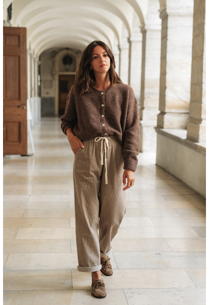 Conseil taille : Manon mesure 1m64 et porte une taille S.La taille S correspond à un 36. La taille M correspond à un 38. La taille L correspond à un 40. Choisissez votre taille habituelle.Le pantalon James est porté avec le pull Alban.