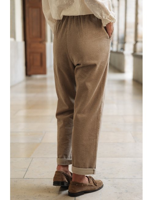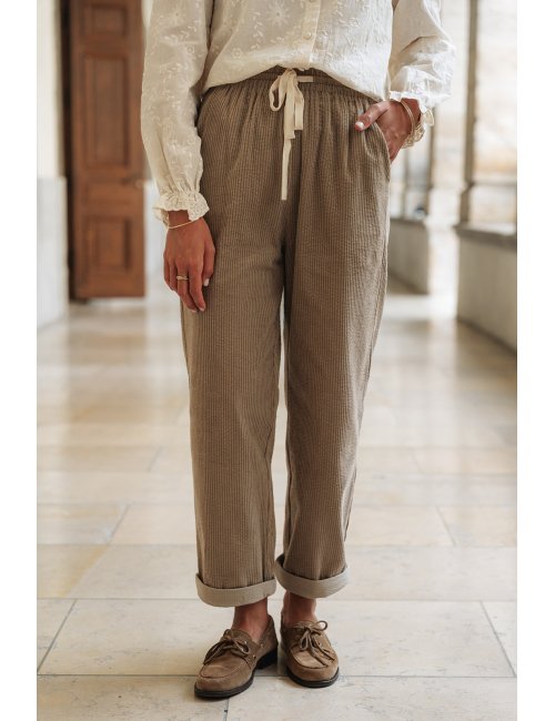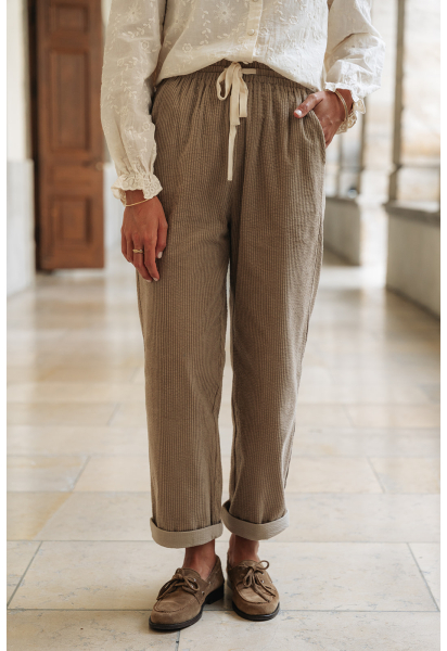 Conseil taille : Manon mesure 1m64 et porte une taille 26.La taille 24 correspond à un 34. La taille 26 correspond à un 36. La taille 28 correspond à un 38. La taille 30 correspond à un 40. Choisissez votre taille habituelle. Entre deux tailles, choisissez la taille en-dessous.Le pantalon Gabriel existe aussi en greige. Il est porté avec la chemise Claudia.