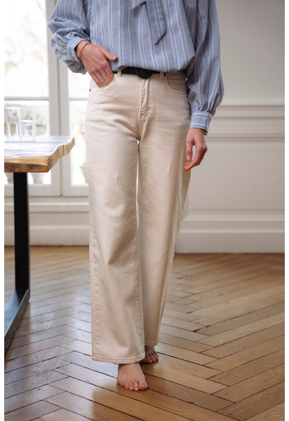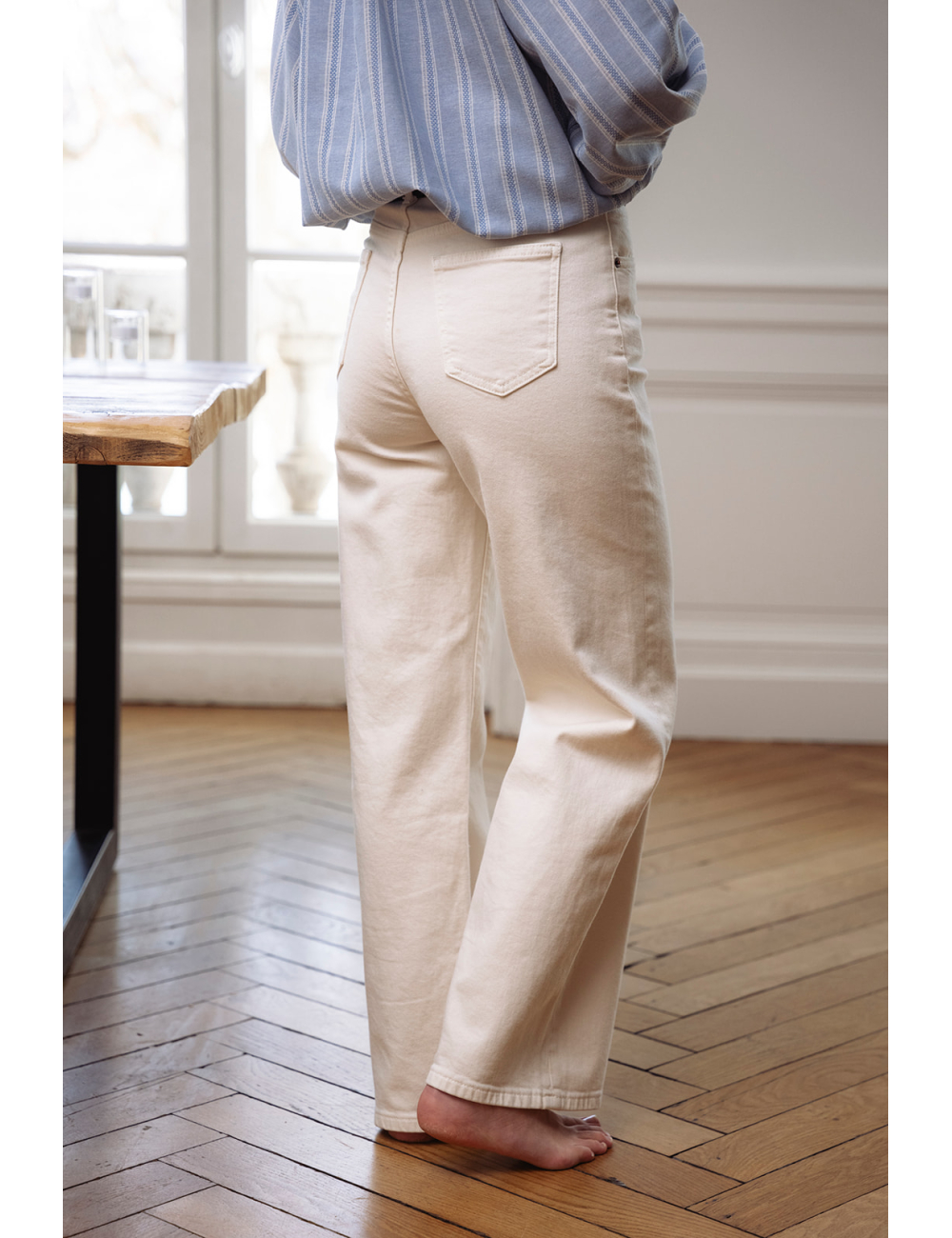 - Taille haute - Fermeture zip et bouton- Poches plaquées sur le devant et au dos - Pantalon ⅞- Coupe droite, jambe large- Longueur 88 cm pour une taille 24- Tailles 24, 26, 28, 30- 100% coton - Lavage à froidLe jean Joé est porté avec la chemise Olympe.