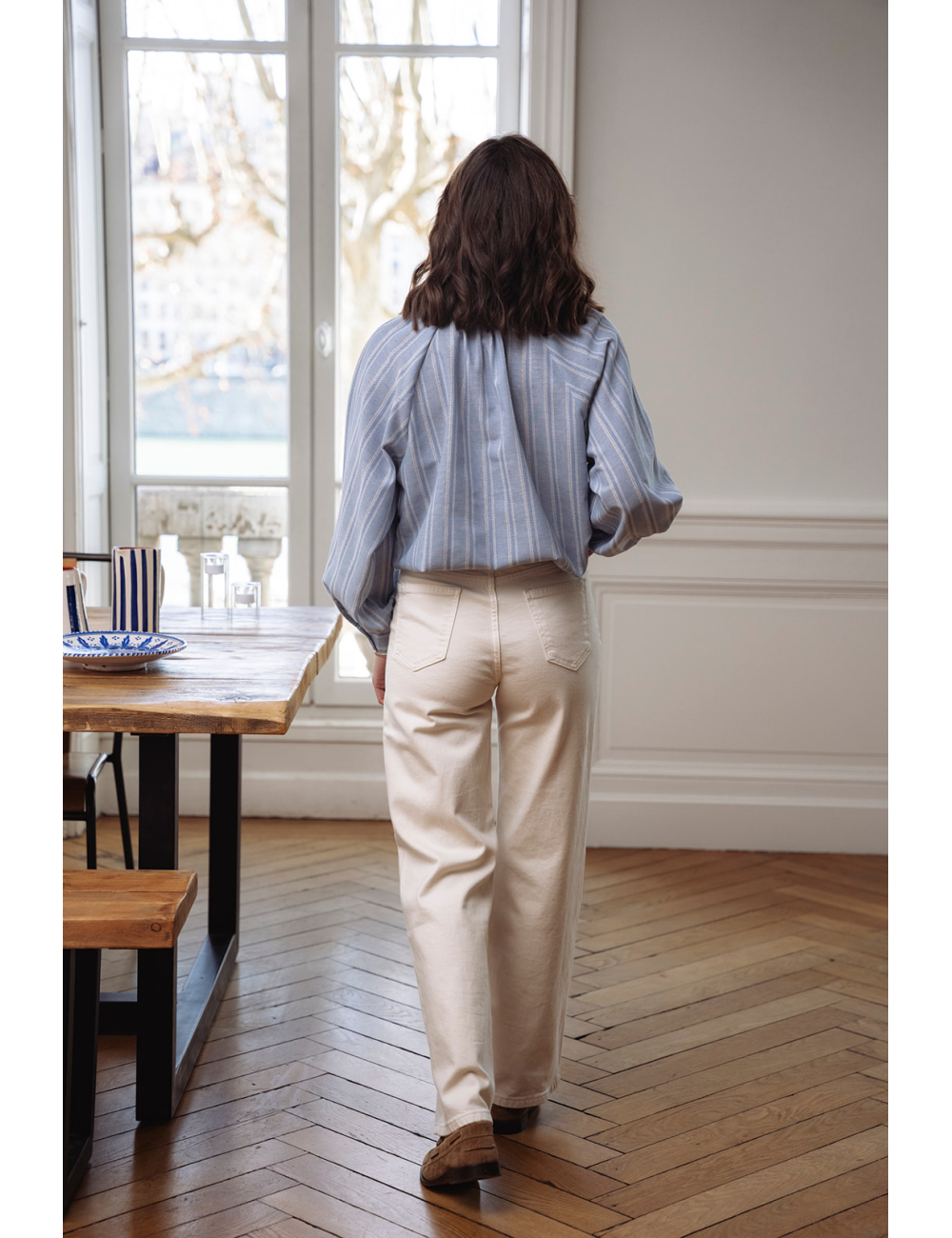 - Taille haute - Fermeture zip et bouton - Passants à la taille - Pantalon 5 poches- Coupe droite - Longueur 96 cm pour une taille XS- Tailles XS, S, M, L - 97% coton, 3% élasthanne - Lavage à froidLe pantalon Tom est porté avec la chemise Colette.