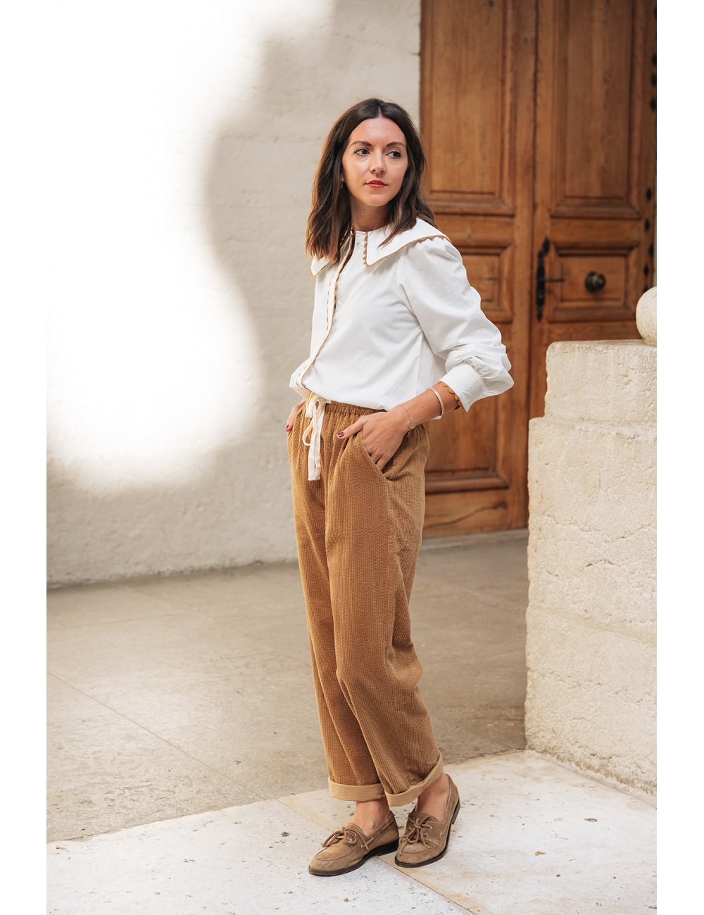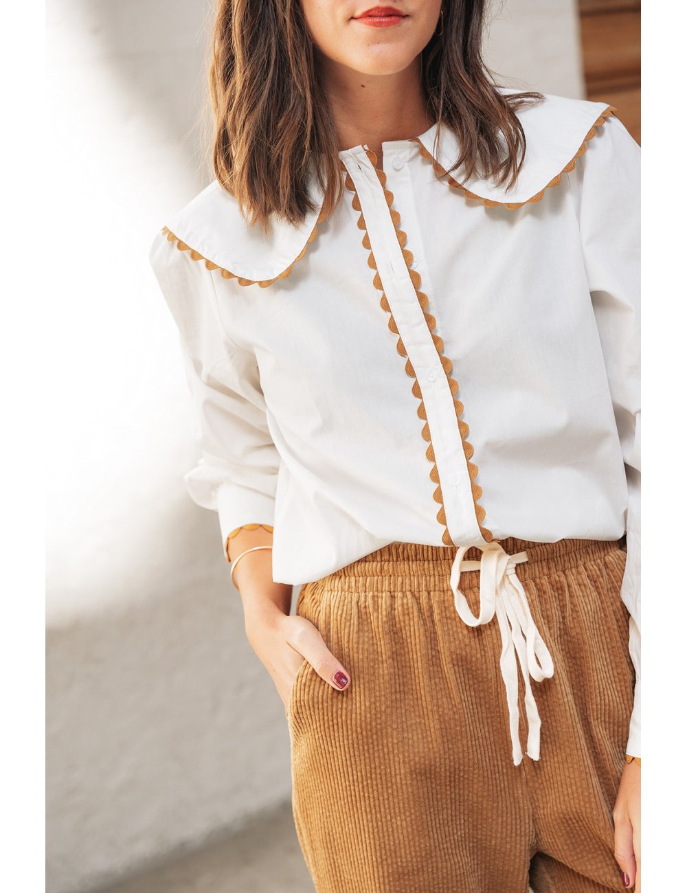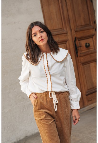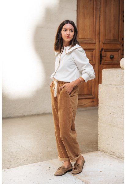 La chemise Claudia est portée avec le pantalon Gabriel ocre.