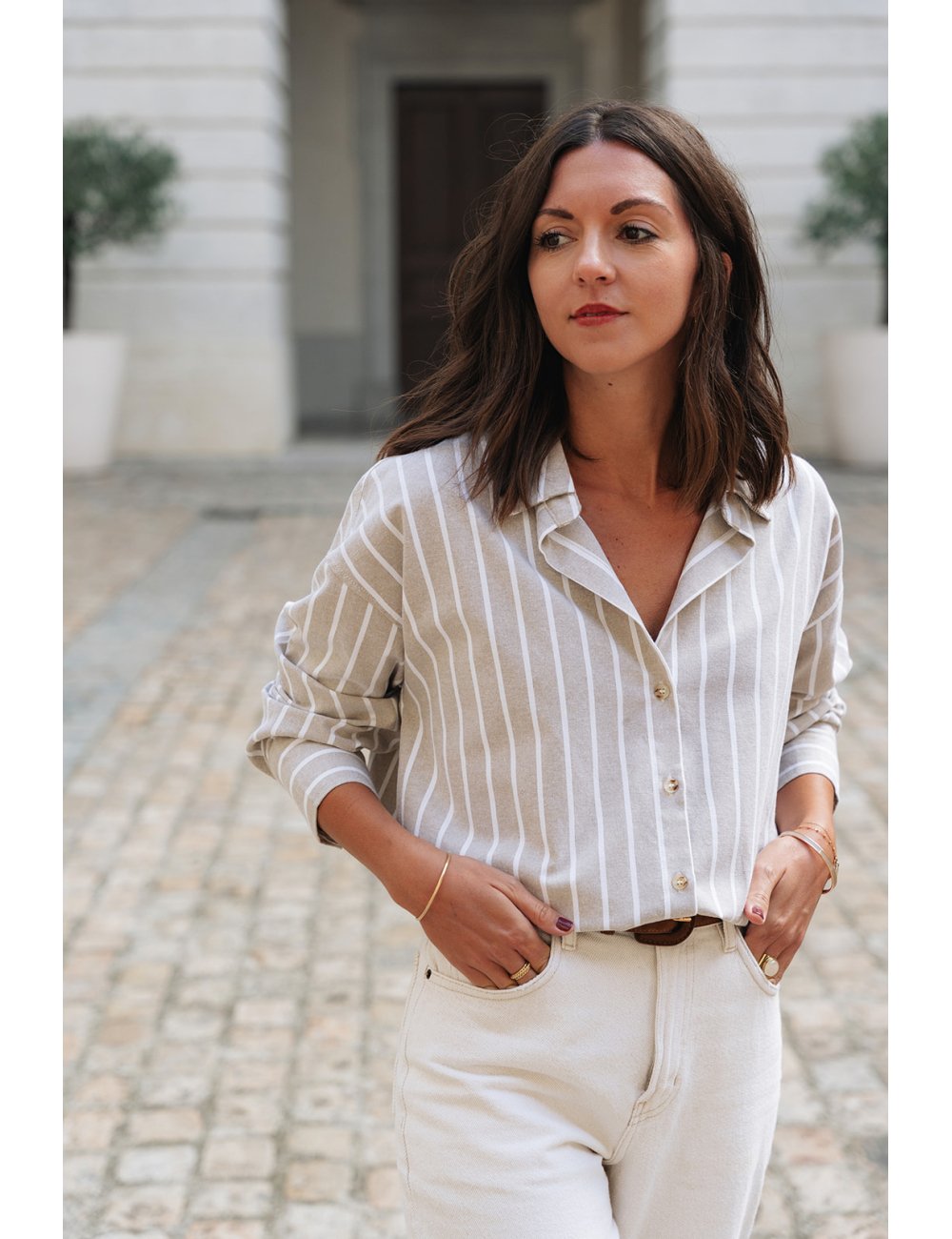 Conseil taille : Manon mesure 1m64 et porte une taille S.La taille S correspond à un 36. La taille M correspond à un 38. La taille L correspond à un 40. Choisissez votre taille habituelle.La chemise Romane est portée avec le pantalon Pablo.