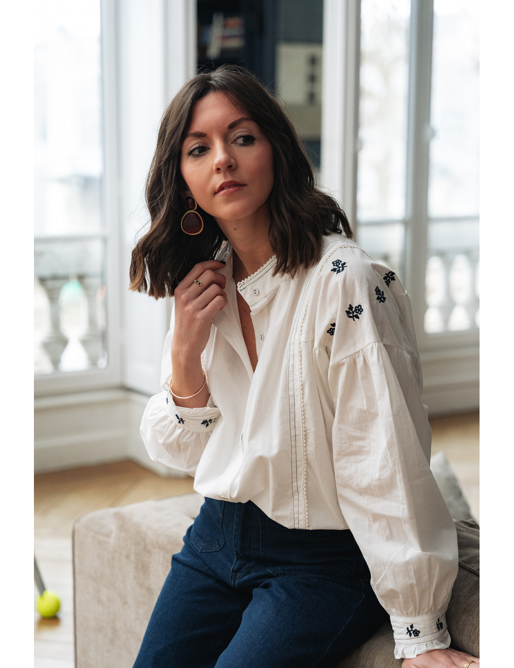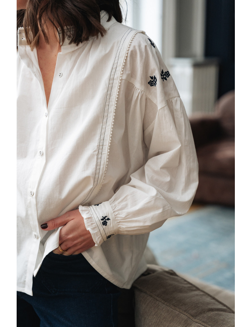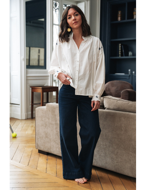 La chemise Flore est portée avec le pantalon Faro.