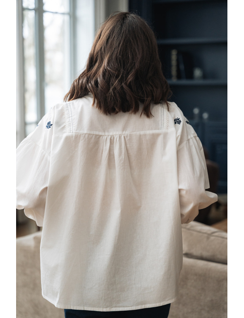 - Manches longues resserrées sur le poignet par un bouton - Col arrondi - Boutonnage intégral - Coupe ample - Fleurs brodées sur la chemise - Longueur 61 cm à partir de l’épaule pour une taille S/M- Tailles S/M, M/L - 100% coton- Lavage à froid
