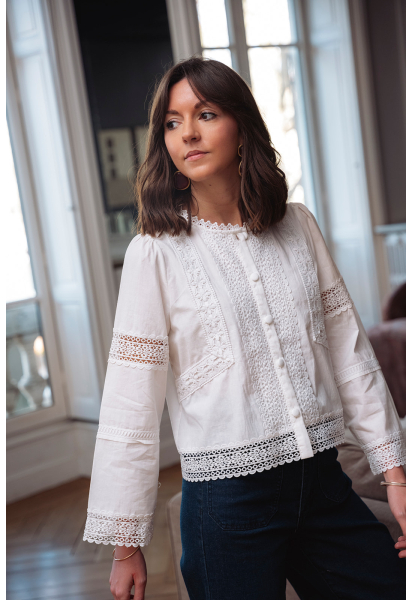 Conseil taille : Manon mesure 1m64 et porte une taille S/M.La taille S/M correspond à un 36/38. La taille M/L correspond à un 38/40. Choisissez votre taille habituelle. Entre deux tailles, choisissez la taille au-dessus.Blouse dentelle blanche
