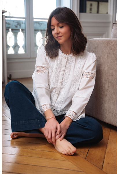 - Manches longues resserrées sur le poignet par un bouton - Encolure arrondie - Dentelle ajourée sur l’ensemble de la blouse - Blouse doublée - Fermeture goutte au dos- Longueur 60 cm à partir de l’épaule pour une taille S- Tailles XS, S, M, L- 100% viscose - Lavage délicat à froidLa blouse Octavie est portée avec le pantalon Azel.