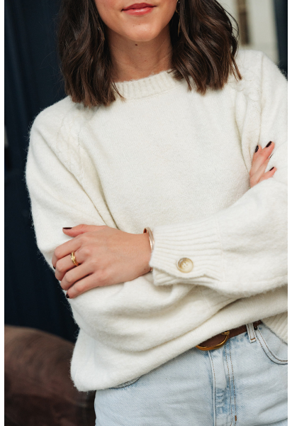 - Manches longues - Encolure arrondie- Boutonnage intégral - Longueur 56 cm à partir de l’épaule- Taille unique - 79% polyester, 13% acrylique, 5% laine, 3% spandex- Lavage à la main Conseil taille :Manon porte habituellement un 36 et mesure 1m64.La taille unique conviendra pour les tailles 36, 38 et 40.Le pull Roméo est porté avec le short Aubin.