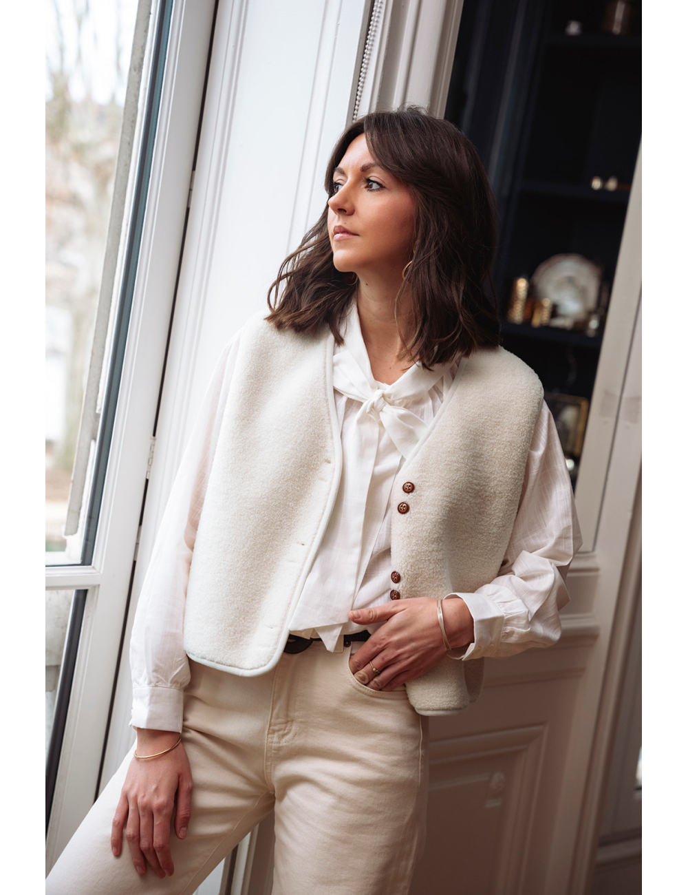 La veste Willow existe aussi en écru. Elle est portée avec la blouse Romy.