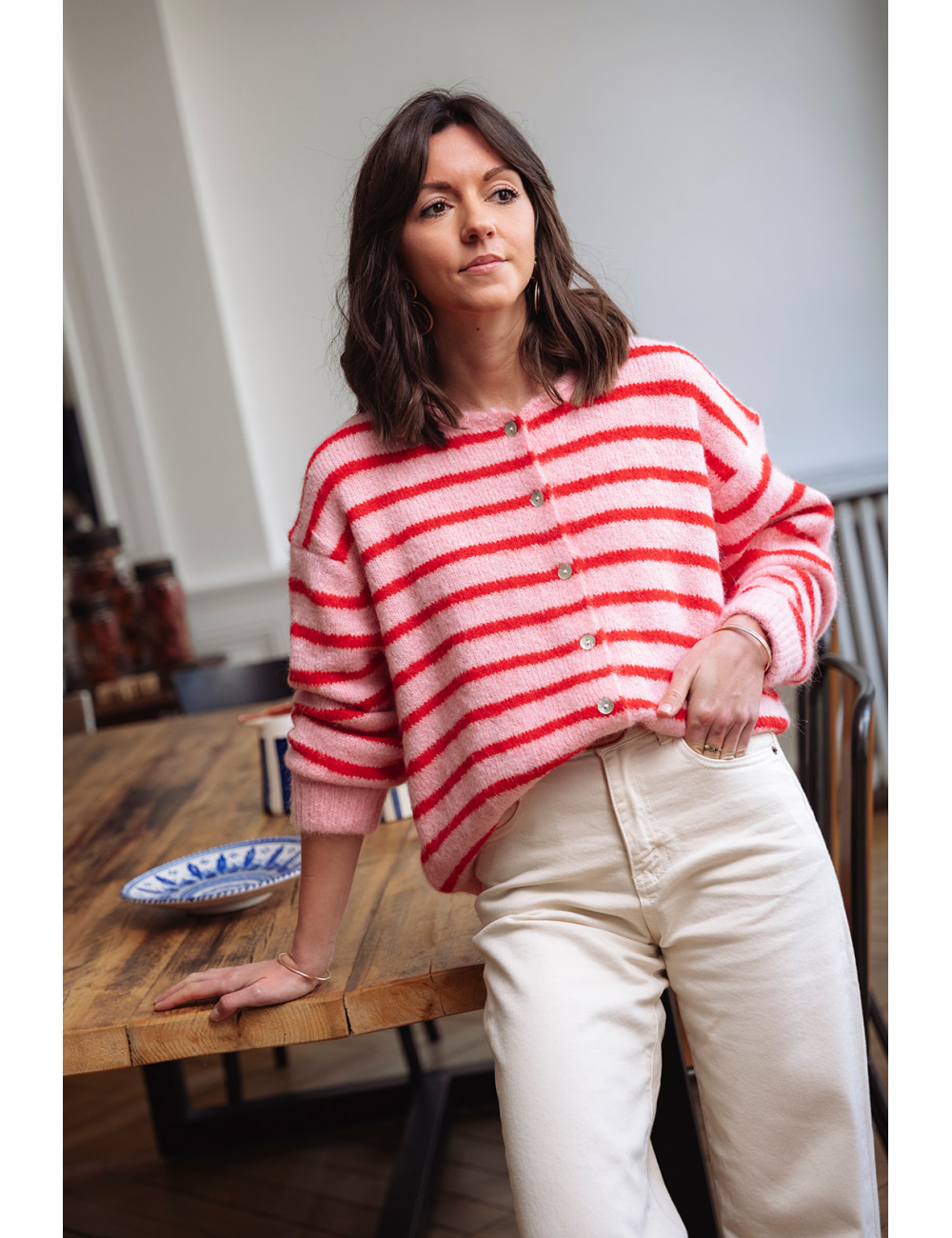 Conseil taille : Manon mesure 1m64 et porte un 36 habituellement.La taille unique conviendra pour les tailles 36, 38 et 40.Le pull Marius est porté avec le foulard Léon.