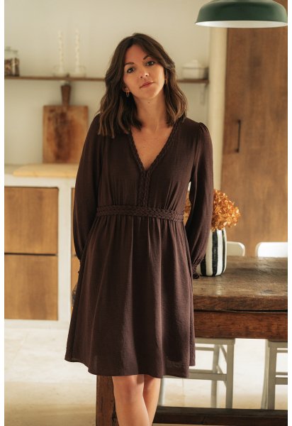 - Manches longues resserrées sur le poignet par un élastique- Encolure V- Détails tressés- Robe doublée- Longueur 89 cm à partir de l’épaule pour une taille S- Tailles XS, S, M, L- 65% coton, 35% viscose- Lavage à froid