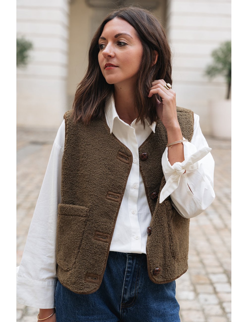 Conseil taille :Manon mesure 1m64 et porte une taille S/M.La taille S/M correspond à un 36/38. La taille M/L correspond à un 38/40. Choisissez votre taille habituelle.Le gilet Orlando est porté avec la blouse Carmen.